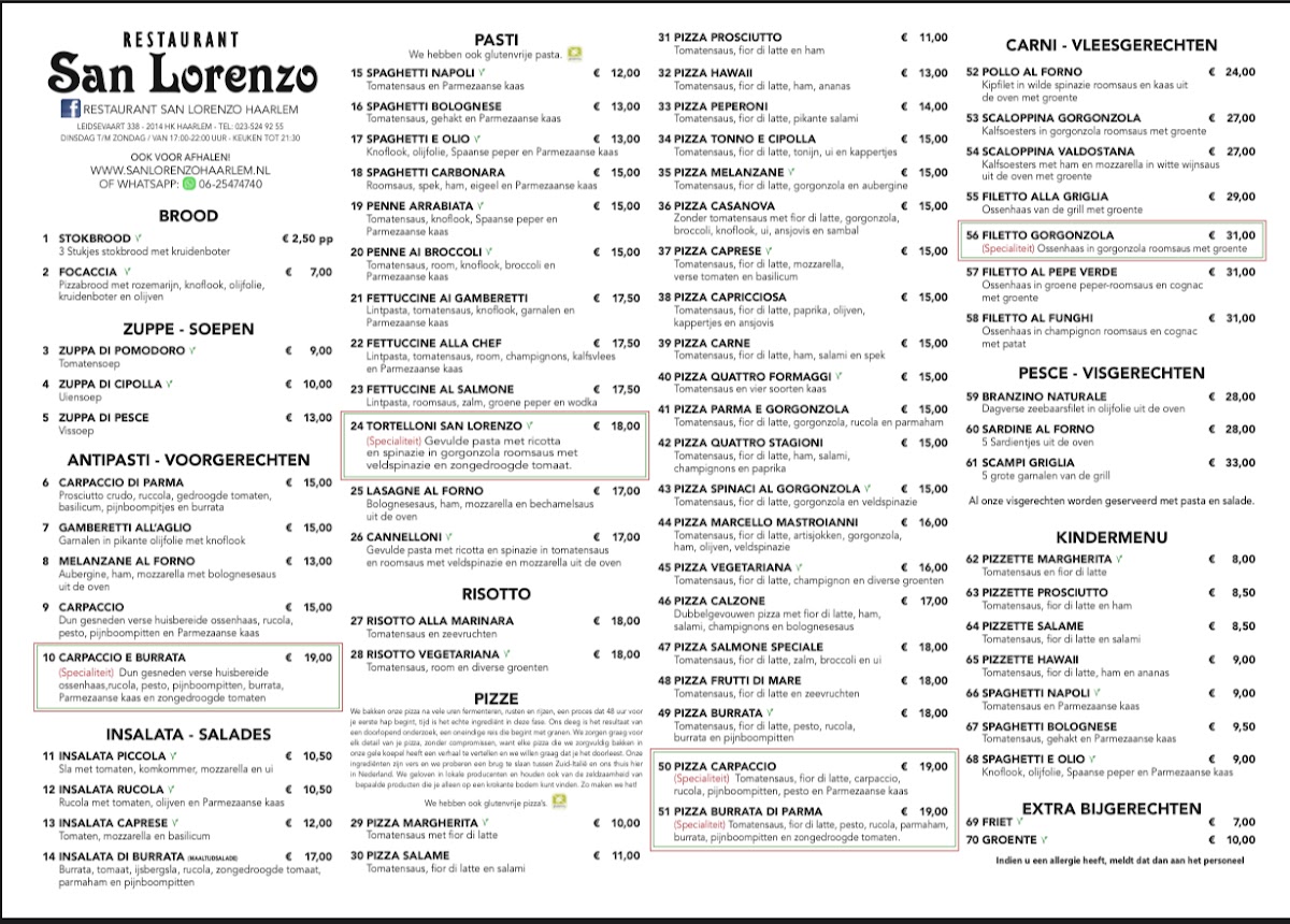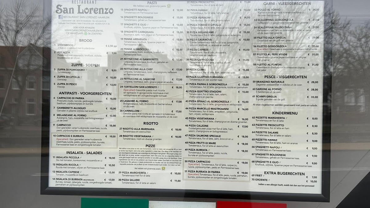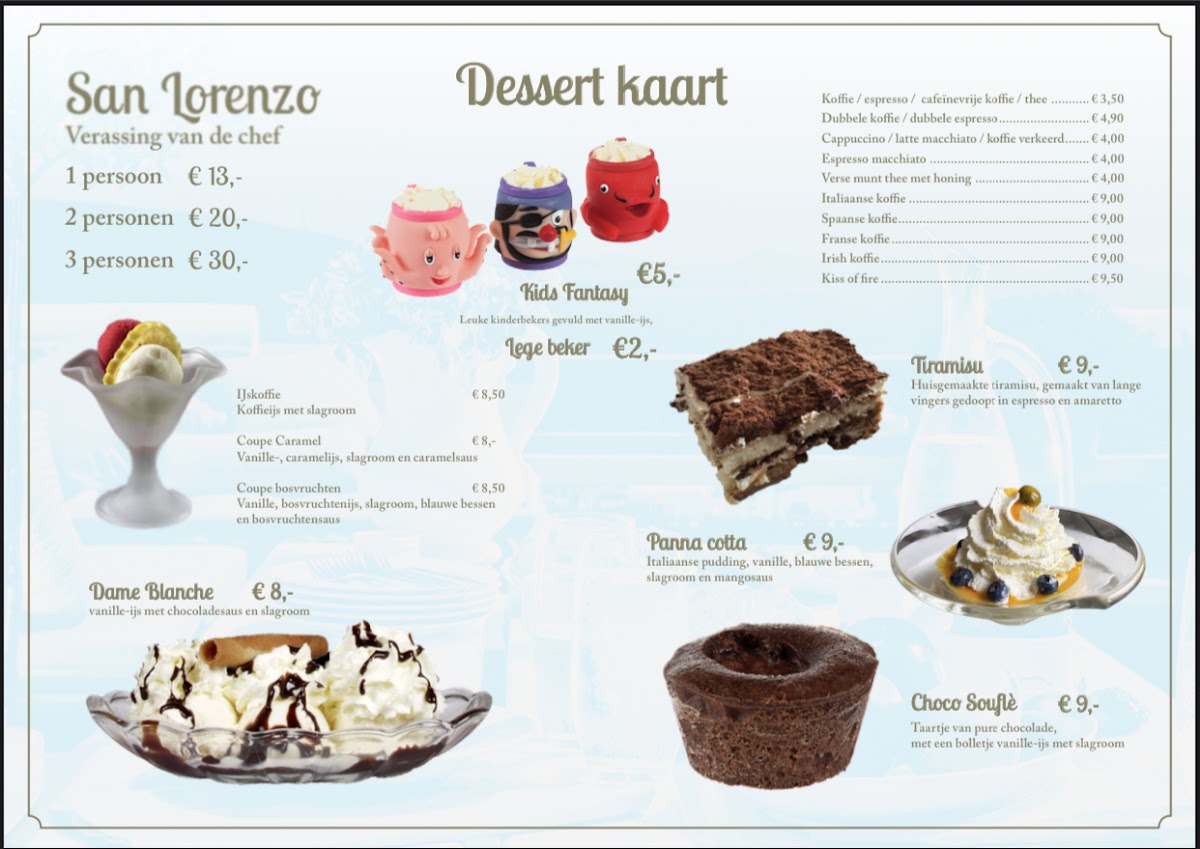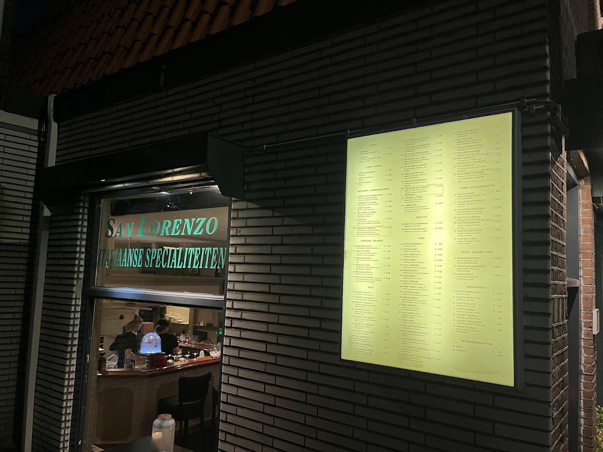 The menu at San Lorenzo offers a delightful range of Italian dishes, perfect for those craving a comforting yet refined dining experience. The Carpaccio stands out as a light yet flavorful starter, with thinly sliced raw beef complemented by tangy dressing. For pizza lovers, the Pizza Peperoni offers a deliciously spicy kick with generous toppings, while the Pizza Vegetariana provides a satisfying mix of fresh vegetables for a more delicate flavor. The hearty Spaghetti Alla Bolognese is a classic, with rich and savory meat sauce that pairs perfectly with al dente pasta. Ending the meal on a sweet note, the Tiramisu is a must-try, offering the ideal balance of creamy and coffee-infused flavors. For a unique dessert experience, the Dame Blancheren Zonder Chocolade delivers a refreshing twist, without the usual chocolate, highlighting a perfect balance of sweetness and texture. San Lorenzo’s menu combines traditional favorites with modern touches, making it a memorable choice for any occasion.
